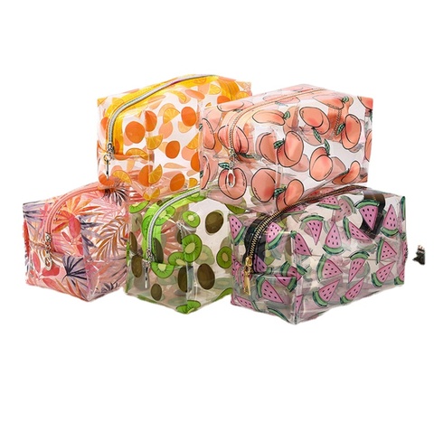 Meyve baskı tasarım açık özel PVC kozmetik çantası plastik şeffaf seyahat sevimli makyaj çantası